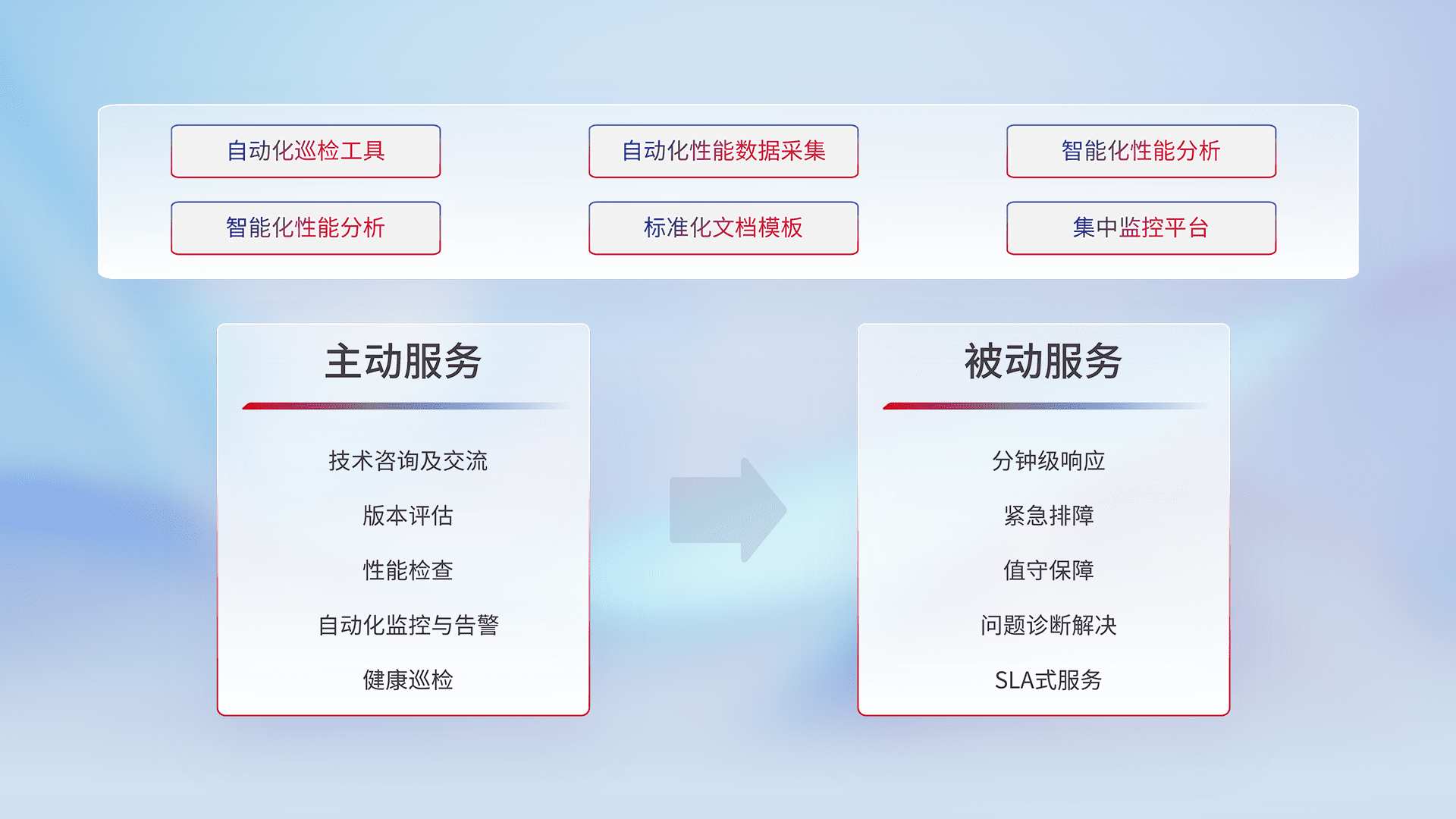 智能化工具和标准化文档,,,,保障服务质量,,提供主动服务(包含技术咨询、、、、版本评估、、性能检查、、自动化监控与告警、、、、健康巡检)和被动服务包含(分钟级响应、、、、紧急排障、、、、值守保障、、问题诊断解决、、SLA服务)。。。。